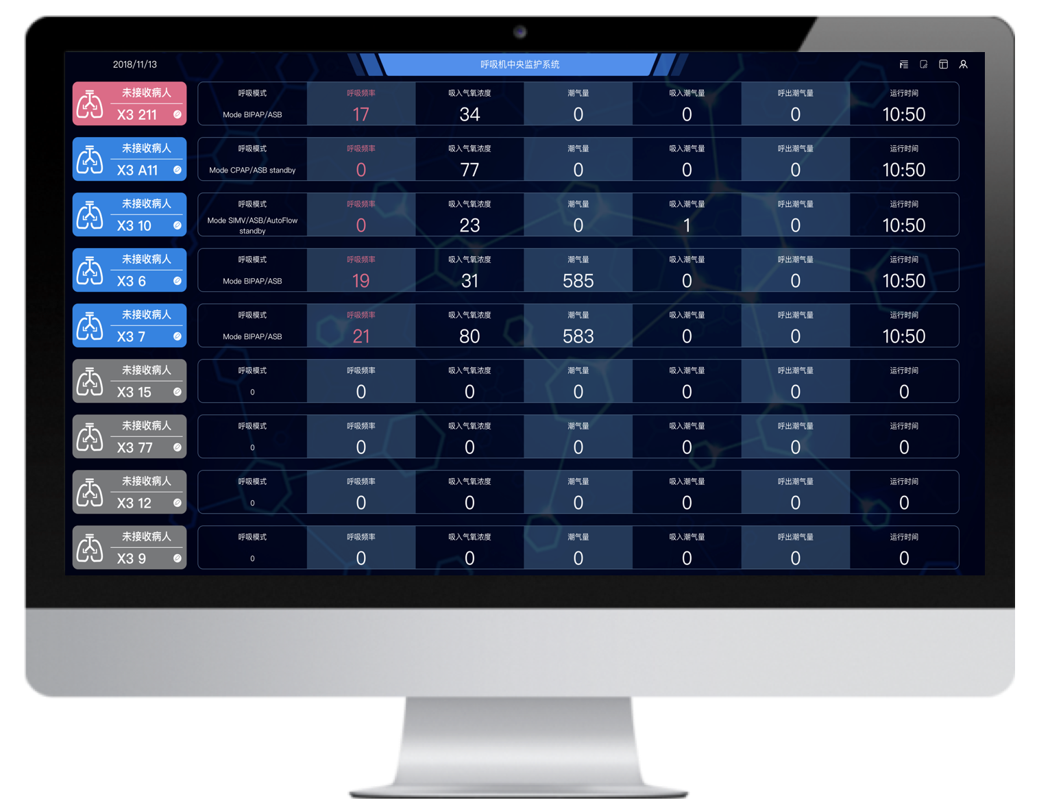 多臺不同品牌的有創呼吸機聯網,并通過大屏實時集中呈現治療預設參數和監測參數,實現多臺集中監測、集中管理和數據存儲。